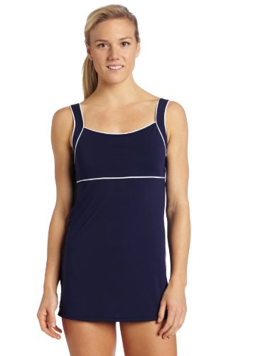 Speedo equals better fit, performance, quality, and innovation! The piped sheath dress swimsuit from our aquatic fitness collection offers maximum coverage with comfortable thick tank straps and built in soft cup construction, made of our exclusive endurance+ chlorine resistant fabric to last 20 times longer than ordinary spandex, it also has our four way stretch technology for a body hugging fit and softer feel, so no bag and sag, and it looks like new for longer, ideal for aqua aerobics or any